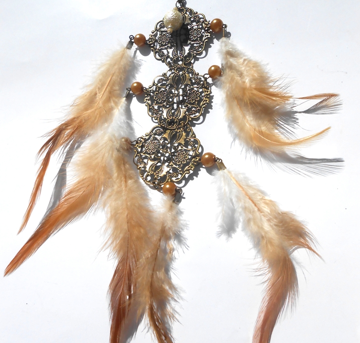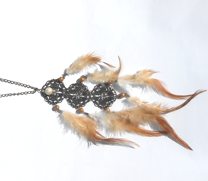 velmi moderní náhrdelník s peříčky a perlami v mosazné barvě - vše tón v tónu... na řetízku