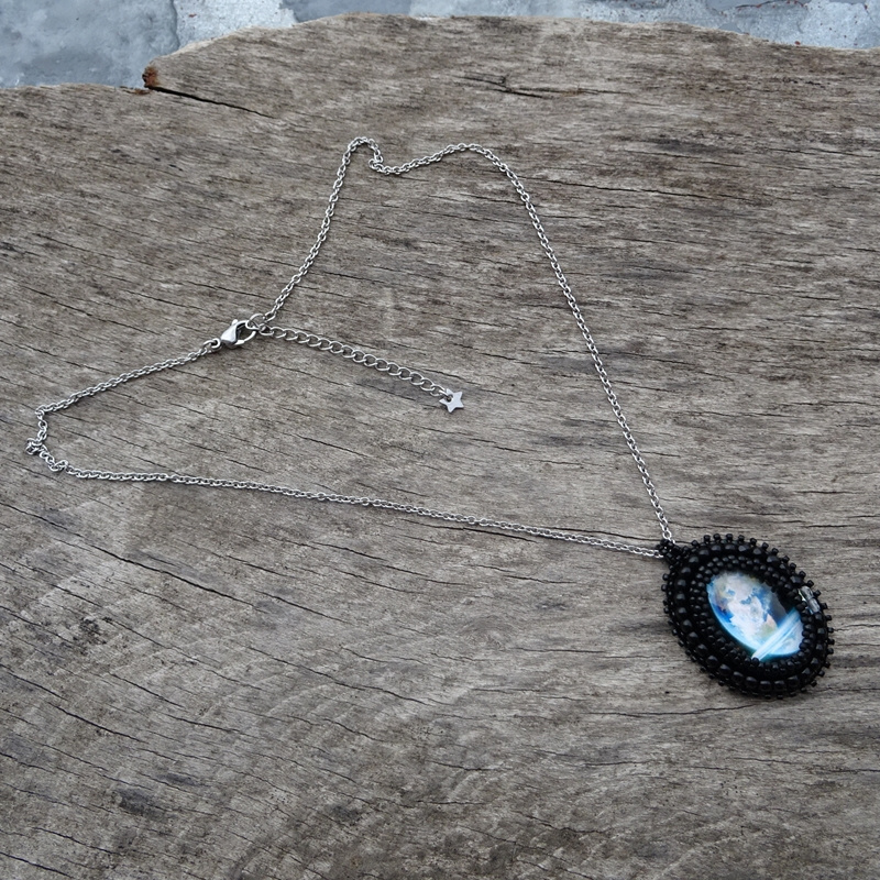 Náhrdelník je vyroben technikou korálkové výšivky, na výšivku jsem použila skleněný kabošon s planetkou, kabošon je je šitý na přírodní plsti černé barvy, obšívaný japonským Toho rokajlem v barvě: černé a černé s matným povrchem. Dále jsem použila malé skleněné kuličky černé barvy. Ze spodu náhrdelníku je Alcantara černé barvy, která zaručuje velice příjemné nošení.