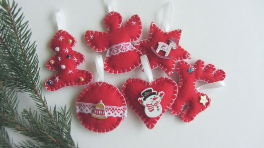 Sada šesti vánočních ozdob z filcu ve svátečních barvách. Ozdoby jsou doplněny korálky a knoflíčky.Velikost ozdob je 6 - 8 cm. Ozdoby jsou opatřeny poutkem na zavěšení a vyplněny dutým vláknem.