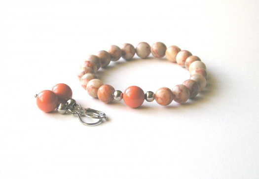 Náramek a náušnice jsou vyrobeny z korálků z přírodního jaspisu 8 mm a Swarovski crystal Pearl, voskovaných perlí v odstínu Coral 10 mm. Dále jsem použila korálky a komponenty z chirurgické oceli. Mechanické zapínání náušnic.