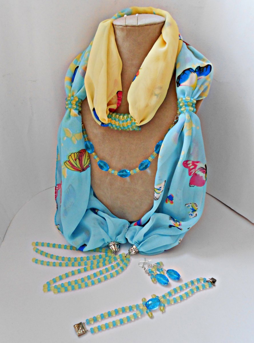 zdobena je průvlekem s korálky, středové části obou stran spojeny jako náhrdelníkem a šála je