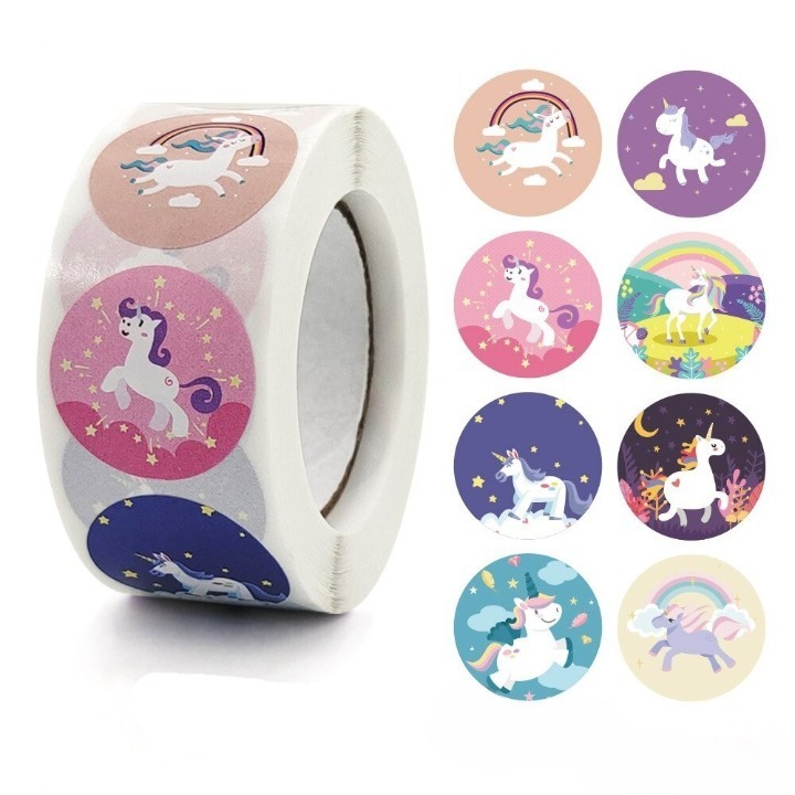 Kulaté papírové samolepky s motivy jednorožců jsou vhodné na zdobení přáníček, sešitů, krabiček apod.