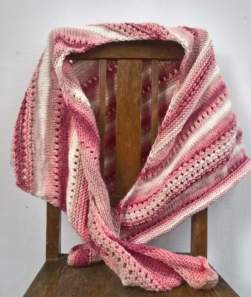 Ručně pletený asymetrický šátek ze silnější příze. Je pletený od jednoho cípu k druhé straně, na šátku se střídá několik vzorů. Barva přechází od přírodní bílé přes béžovou k několika odstínům růžové. Materiál 100% akryl.