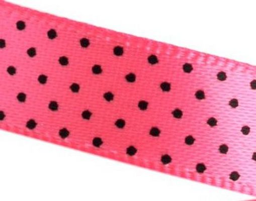 Růžová saténová stuha s černými puntíky šíře 10 mm.