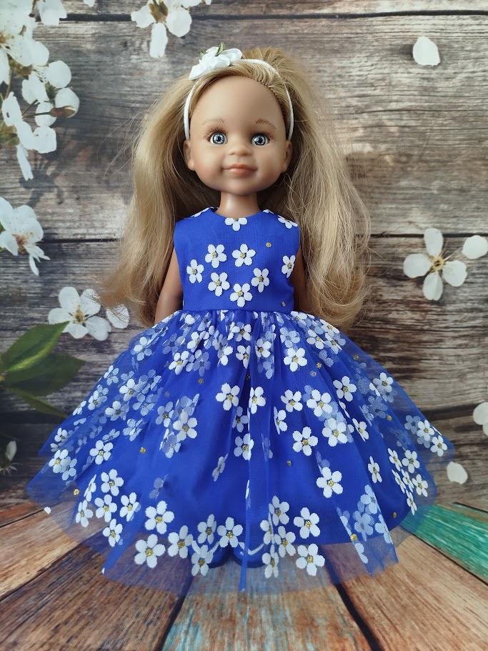 Šatičky pro panenky Paola Reina 32cm, šité z bavlněné látky a potištěného šifonu, vzadu zapínání na patentky. Mají rozměry: obvod pasu cca 15cm, přes hrudník cca 14cm, délka šatiček od ramene dolů je 19cm, od ramene k pasu 6cm, sukně od pasu dolů 13-14cm.