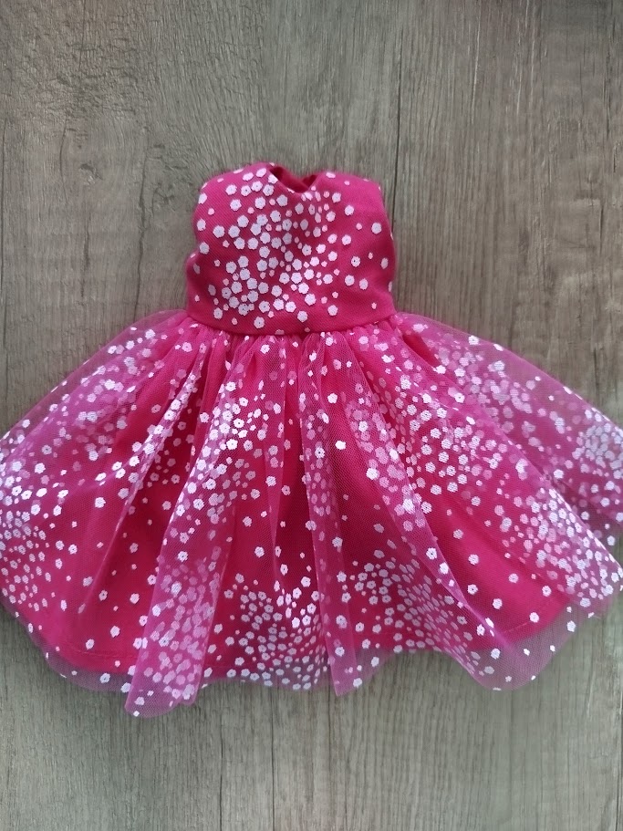 Šatičky jsou šité z bavlněné látky a potištěného šifonu, vzadu mají zapínání na patentky, mají rozměry: obvod pasu cca 15cm, přes hrudník cca 14cm, délka šatiček od ramene dolů je 19cm, od ramene k pasu 6cm, sukně od pasu dolů 13-14cm.