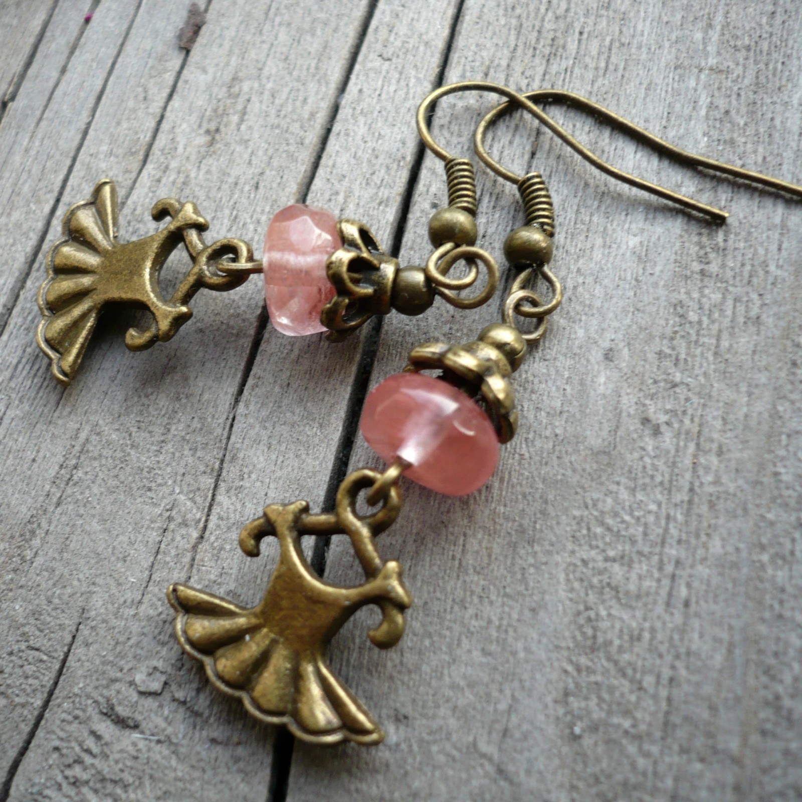 Náušnice ve stylu vintage - mosazné šatičky a rondelka z růžového jadeitu. Délka od háčku 3 cm, gumové zarážky
