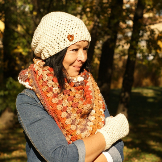 Šatka je uháčkovaná z jemnučkej, veľmi príjemnej akrylovej priadze, ktorej farby prechádzajú cez rôzne odtiene hnedej, terakotovej a béžovej