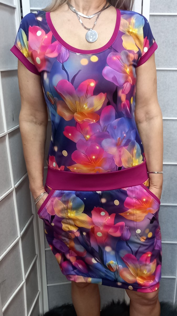 Střih je mírně projmutý, s přinechanými rukávky, hluboký kulatý výstřih, na sukni všité 2 kapsy.