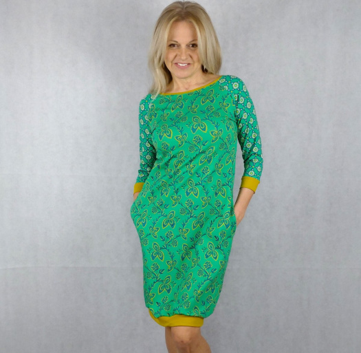 Ušité z elastického jednolícního úpletu bavlna s lycrou. Pohodlný projmutý střih, volnější na tělo. Mírně do áčka, dole vsazeno do dvojitého pružného lemu. Raglánové rukávy. Boční kapsy.