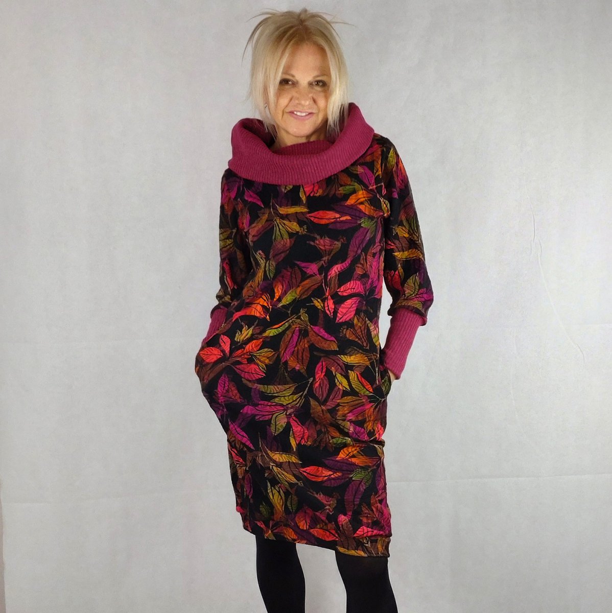Ušité z krásného dvojvrstvého úpletu ve složení viscóza/polyester/elastan.. Široký rolák a manžety z elastické svetroviny. (bavlna/polyester/elastan) Pohodlný projmutý střih, volnější na tělo. Dvojitý pružný spodní lem. Boční kapsy.