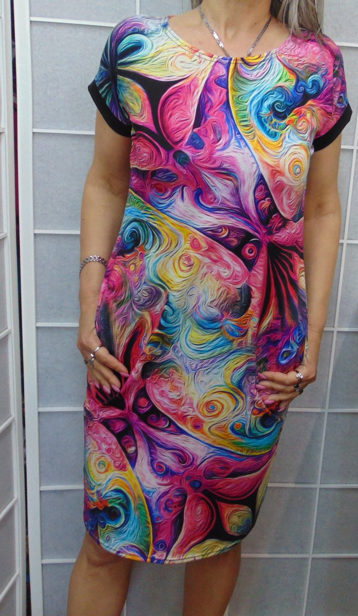 Střih je mírně projmutý, přinechané rukávy, sukně je do úzka, v bočních švech všité kapsy.