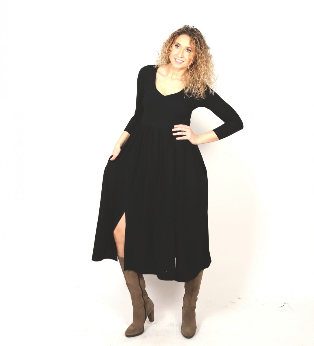 Šaty jsou ušité z úpletu viskóza/elastan. Mají dlouhou rozevlátou sukni a dva rozparky. Výstřih do tvaru srdce. V horní části jsou přiléhavé a pod prsy se rozvoňují do široké sukně sukně s nepravidelnou délkou.