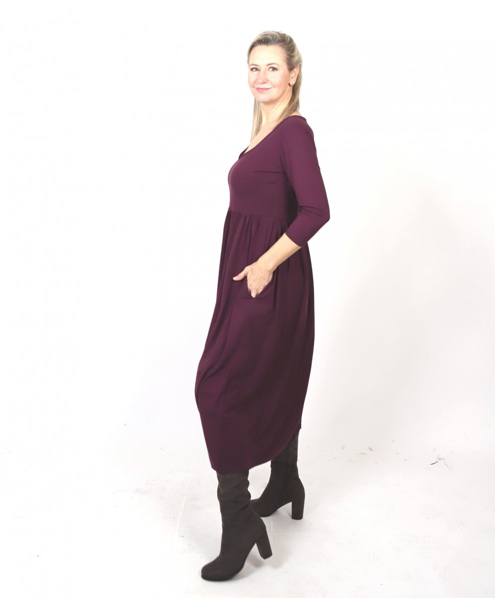 Šaty jsou ušité z úpletu viskóza/elastan. Mají dlouhou rozevlátou sukni a dva rozparky. Výstřih do tvaru srdce. V horní části jsou přiléhavé a pod prsy se rozvoňují do široké sukně sukně s nepravidelnou délkou.