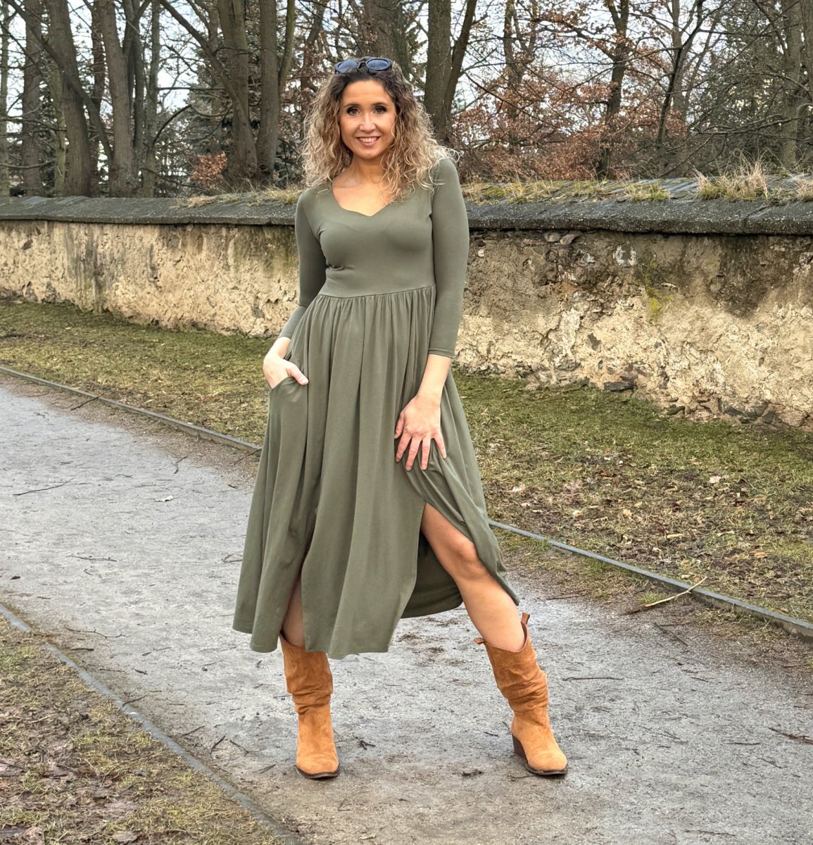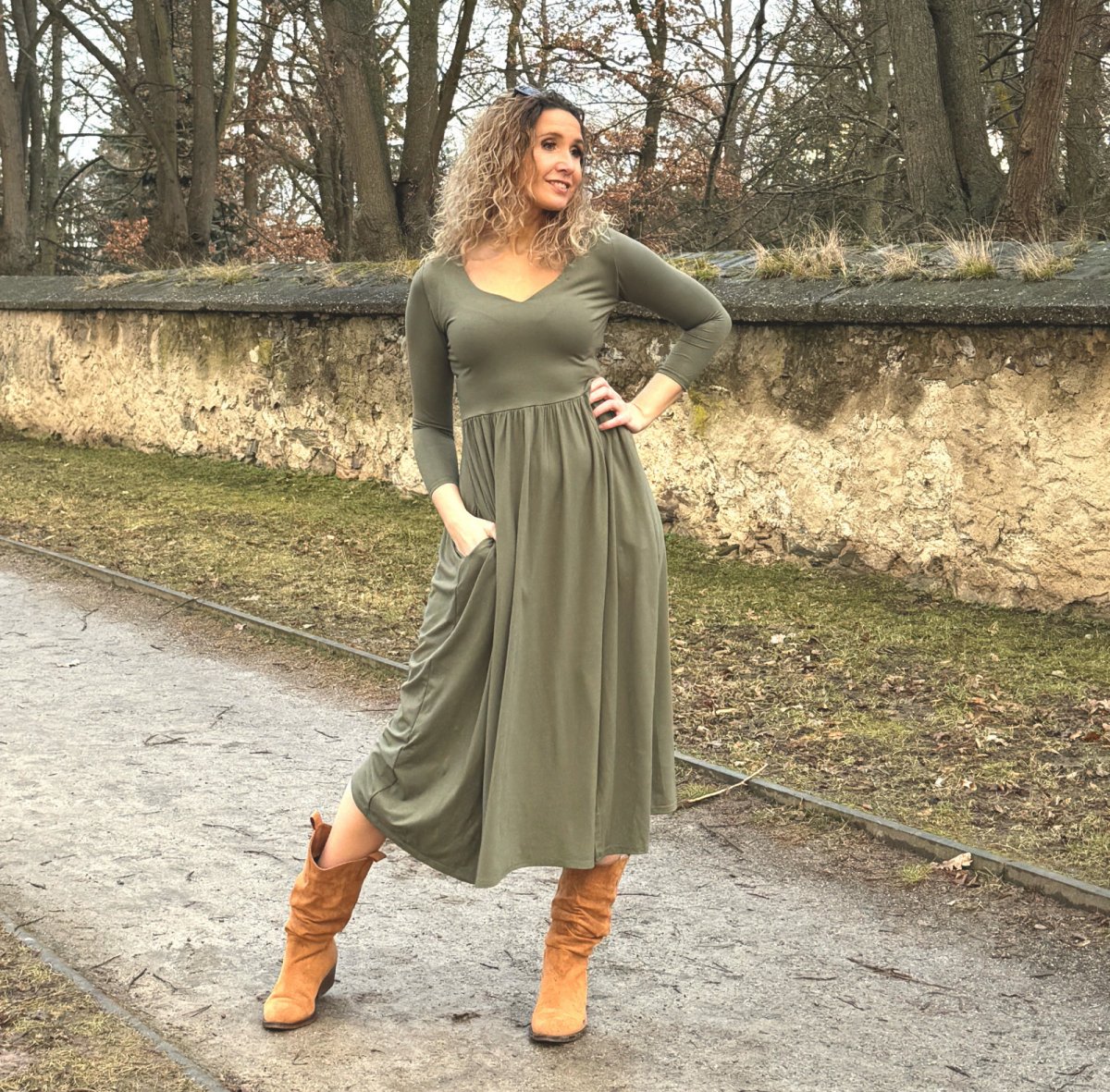 Šaty jsou ušité z úpletu viskóza/elastan. Mají dlouhou rozevlátou sukni a dva rozparky. Výstřih do tvaru srdce. V horní části jsou přiléhavé a pod prsy se rozvoňují do široké sukně sukně s nepravidelnou délkou.
