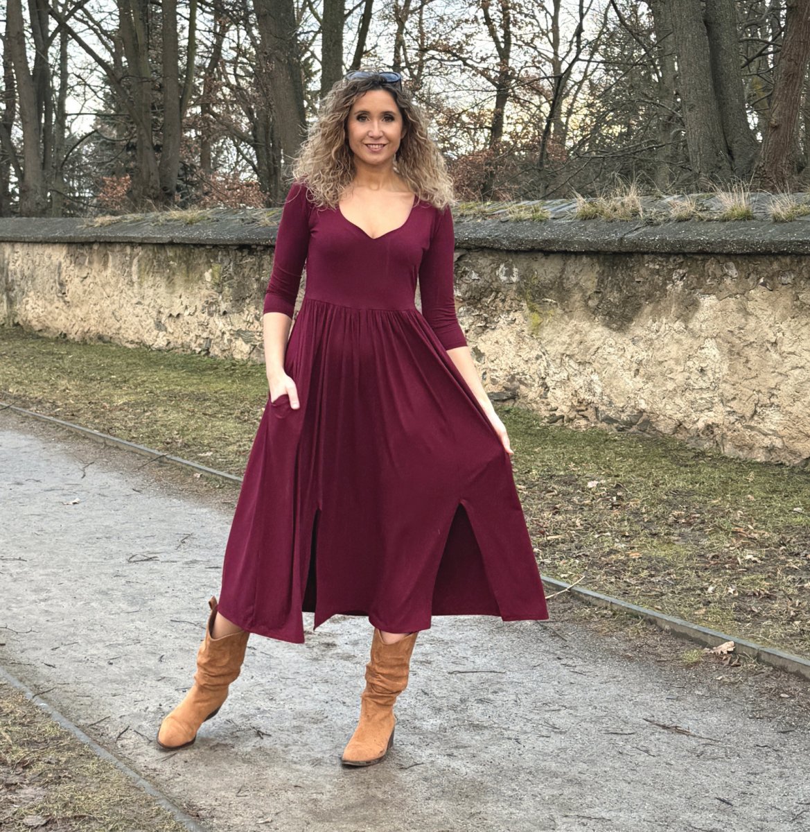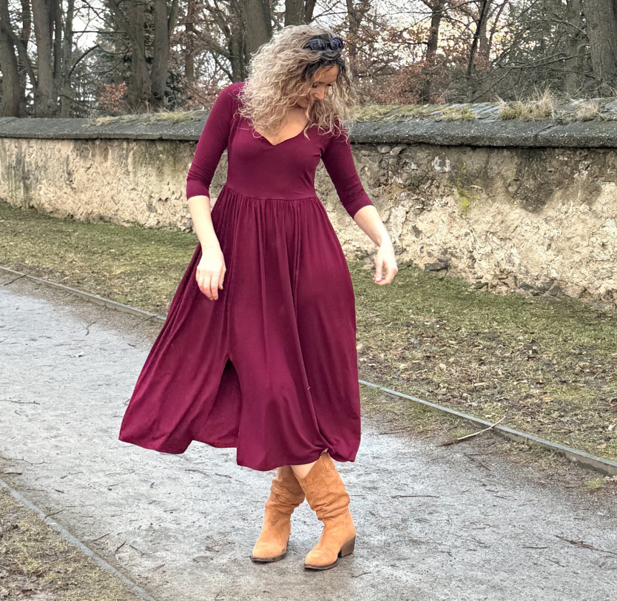 Šaty jsou ušité z úpletu viskóza/elastan. Mají dlouhou rozevlátou sukni a dva rozparky. Výstřih do tvaru srdce. V horní části jsou přiléhavé a pod prsy se rozvoňují do široké sukně sukně s nepravidelnou délkou.