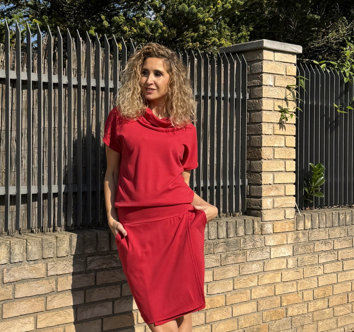 Šaty mají navolněný roláček,Sukně je zavinutá a všitá do pružného pásku. V bočních švech jsou kapsy.