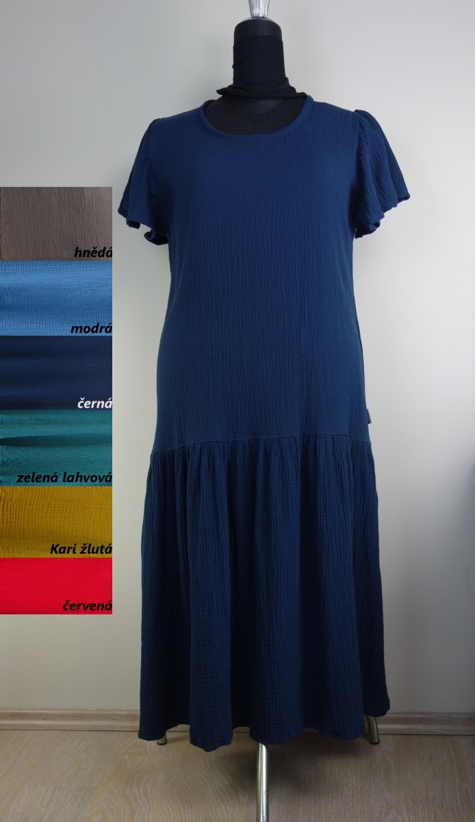 ednoduché letní šaty z prodyšné gázoviny...volnější střih do A - na pohodu. Ve spodní části volán, rukáv krátký s nabráním (možný i spadený). Na fotce tmavá modrá barva - možnost taky v barvách podle vzorkovníku (napište do poznámky v objednávce požadovanoý odstín)