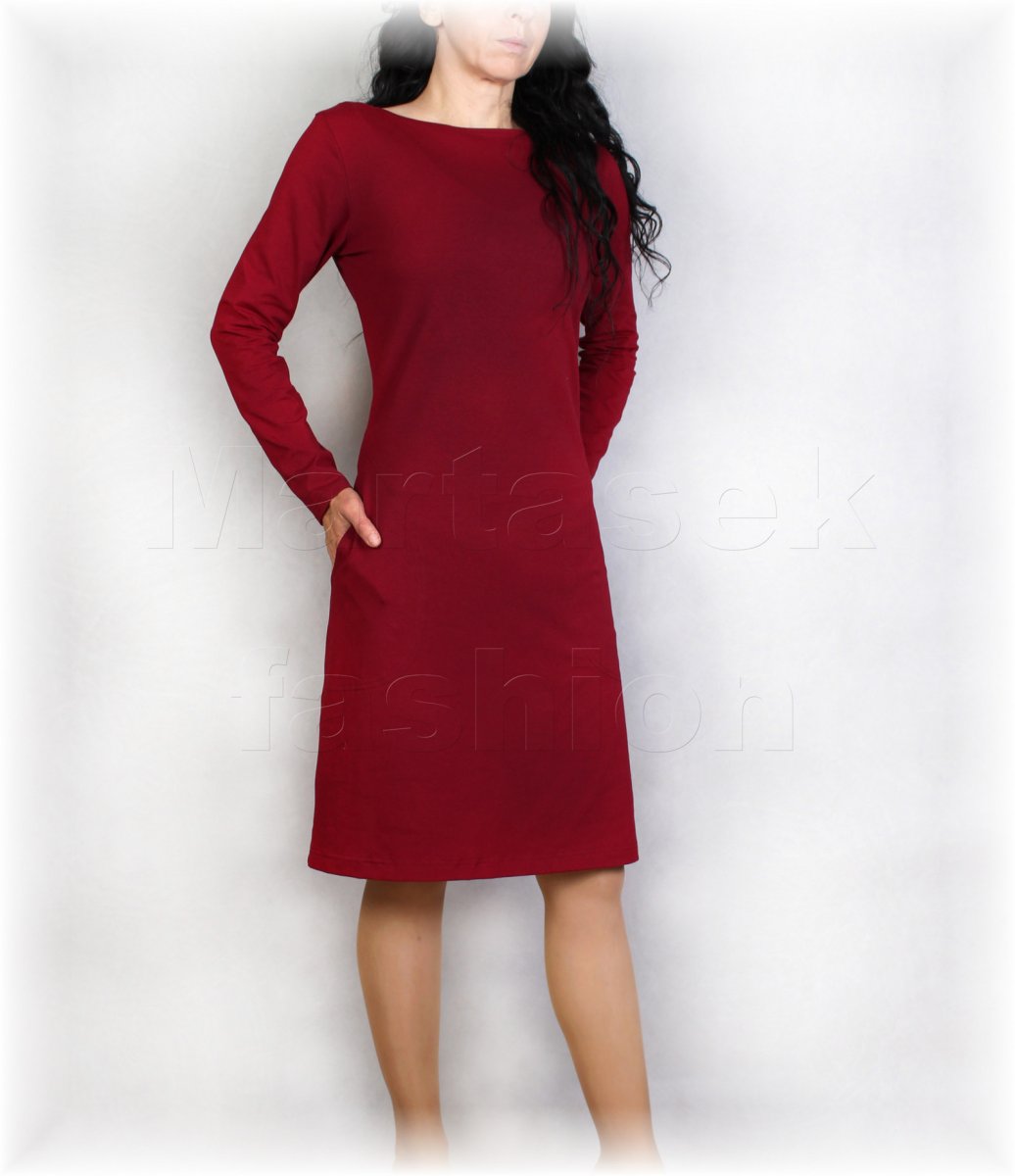 Šaty polopřiléhavého střihu z bavlněného, elastického úpletu ve střední gramáži. Materiál dobře drží tvar, nevytahuje se. Pohodlný střih, od boků mírně do A, kapsy v bočním švu, krátký nebo 3/4 rukáv. Hladké bez přestřižení. Velký výběr barev od klasiky až po pastelové tóny. Nafocené šaty jsou v barvě -bordó.