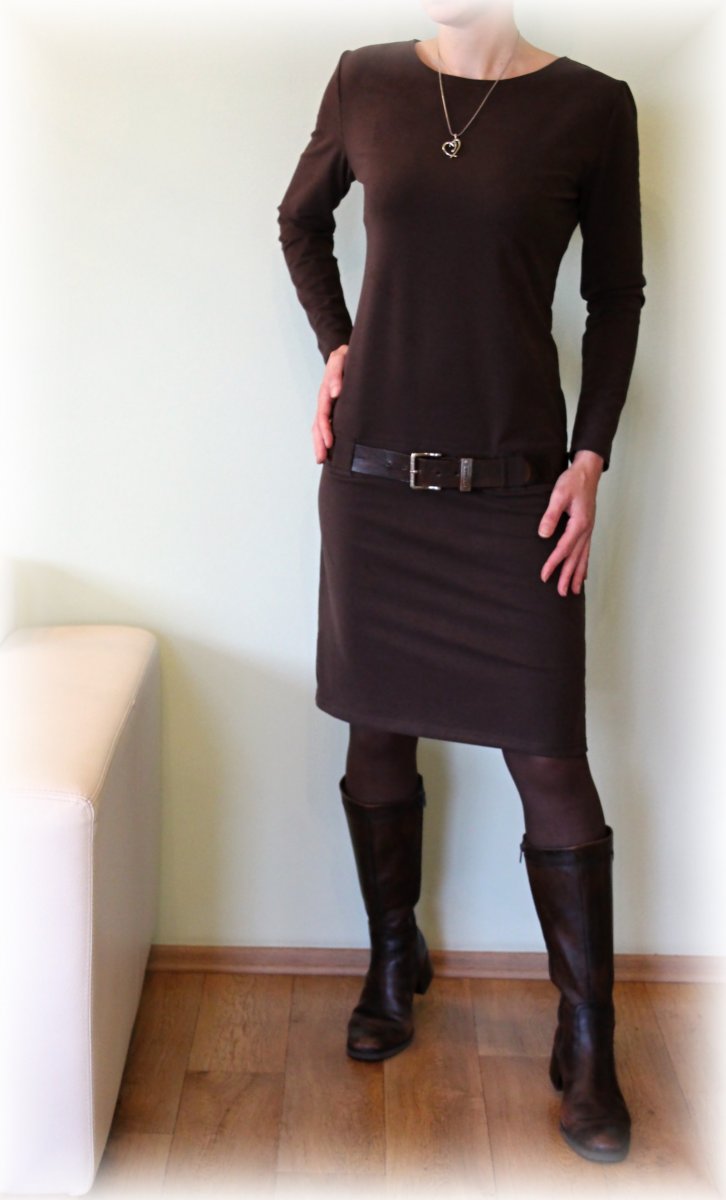 Materiál dobře drží tvar, nevytahuje se.Pohodlný střih, kapsy, krátký nebo 3/4 rukáv. Přestřižení ve sníženém pase. Velký výběr barev od klasiky až po pastelové tóny.Nafocené šaty jsou v barvě tmavě hnědé-čokoládové.