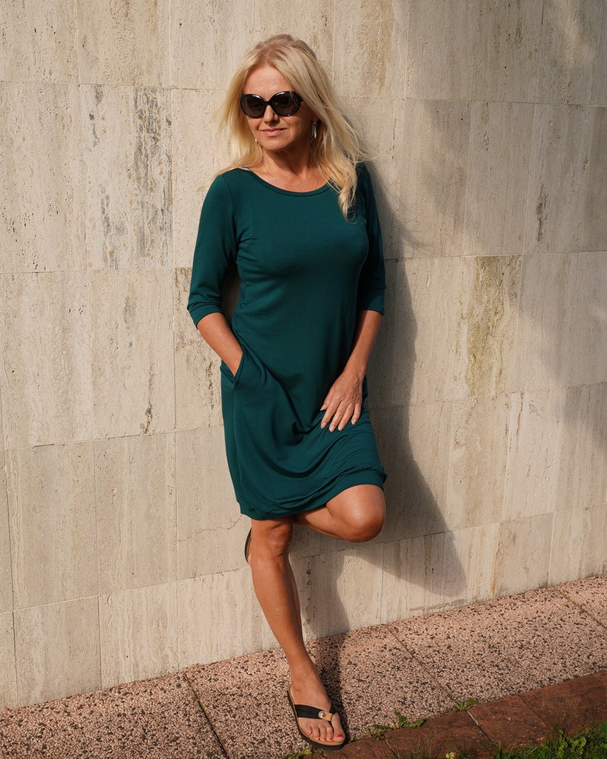 Ušité z tenčí splývavé elastické teplákoviny ve složení viscóza/polyester/lycra. Pohodlný projmutý střih, volnější na tělo.