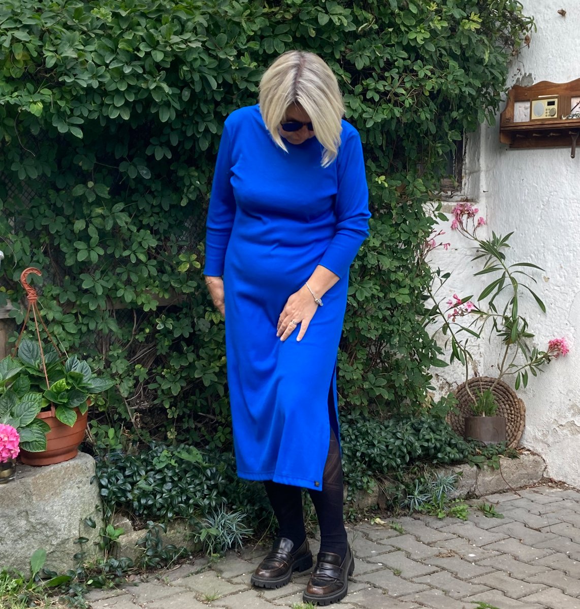 Objevte pohodlí a eleganci s těmito žebrovanými šaty v krásné modré barvě. Vyrobené z kvalitního úpletu, který zajišťuje příjemný pocit na pokožce po celý den. Dlouhý střih s rozparkem dodává šatům moderní vzhled, ideální pro každodenní nošení nebo speciální příležitosti.