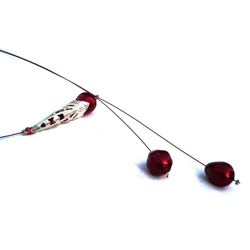 Náhrdelník tvoří bižuterní lanko červené barvy, velký kovový zdobný komponent (kaplík) stříbrné barvy a velké ďubkaté červené voskované kapky. Obvod náhrdelníku je 47,5 cm. Délka dvou "ocásků", které směřují do středu výstřihu, je 7 a 8,7 cm - na přání mohu zkrátit. Zapínání je na karabinku a protikroužek. Použité kovové komponenty jsou z obecného kovu stříbrné barvy.