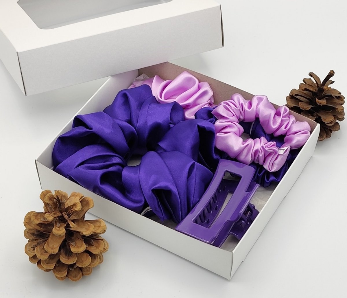 Dárková sada je nakombinovaná v tmavě fialové a fialově růžové barvě.