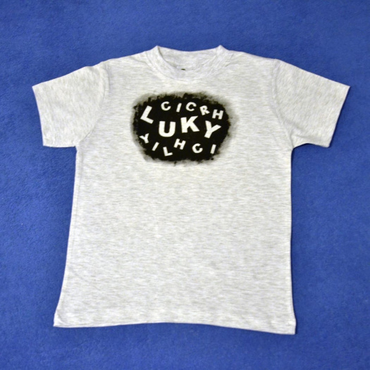 Dětské tričko barvy šedý melír, na přední straně černá písmenka, z kterých je poskládané jméno Luky, velikost na 8 let.
