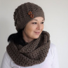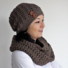 Zimný háčkovaný set šedohnedej farby.Skladá sa z čiapky baretkovégho typu a veľkého nákrčníka na dve až tri omotania.Materiál: akryl