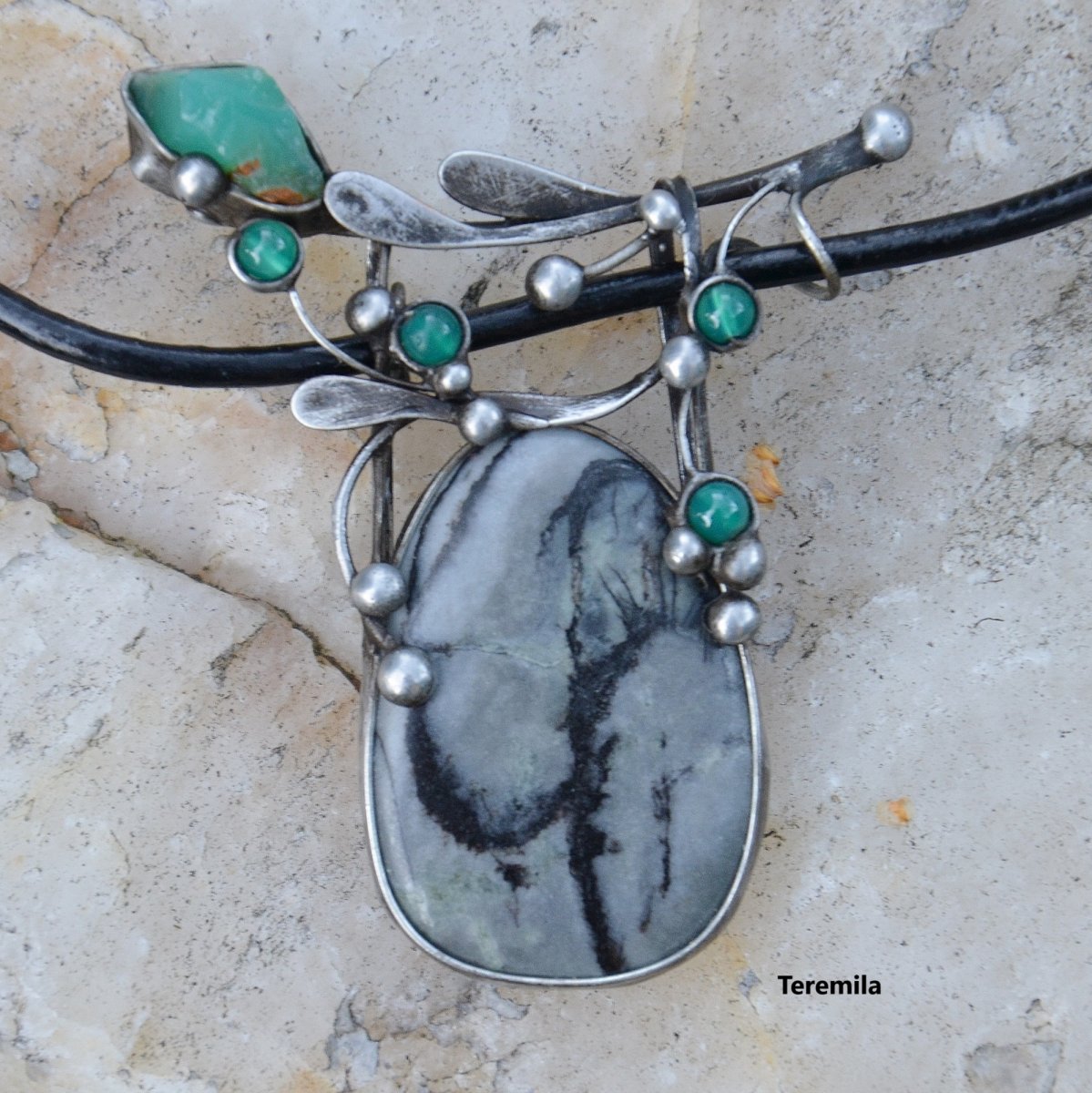Šperk je vyroben cínováním. Je tvořen jedním krásným kabošonem jpísmenkového jaspisu. Kámen měří 4 x 3 cm. Má zajímavou kresbu. Na šedém podkladu, černé silné a slaboučké čárky, které procházejí kamenem. Doplňuje jej zelený surový smaragd.