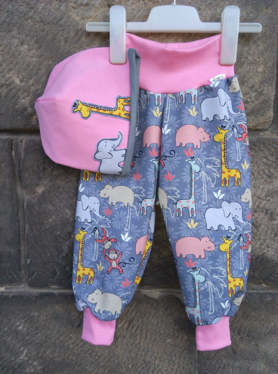 Pohodlné tepláčky v pase se širokým lemem dole do nápletu +dvojitá čepička s aplikací zvířátek.