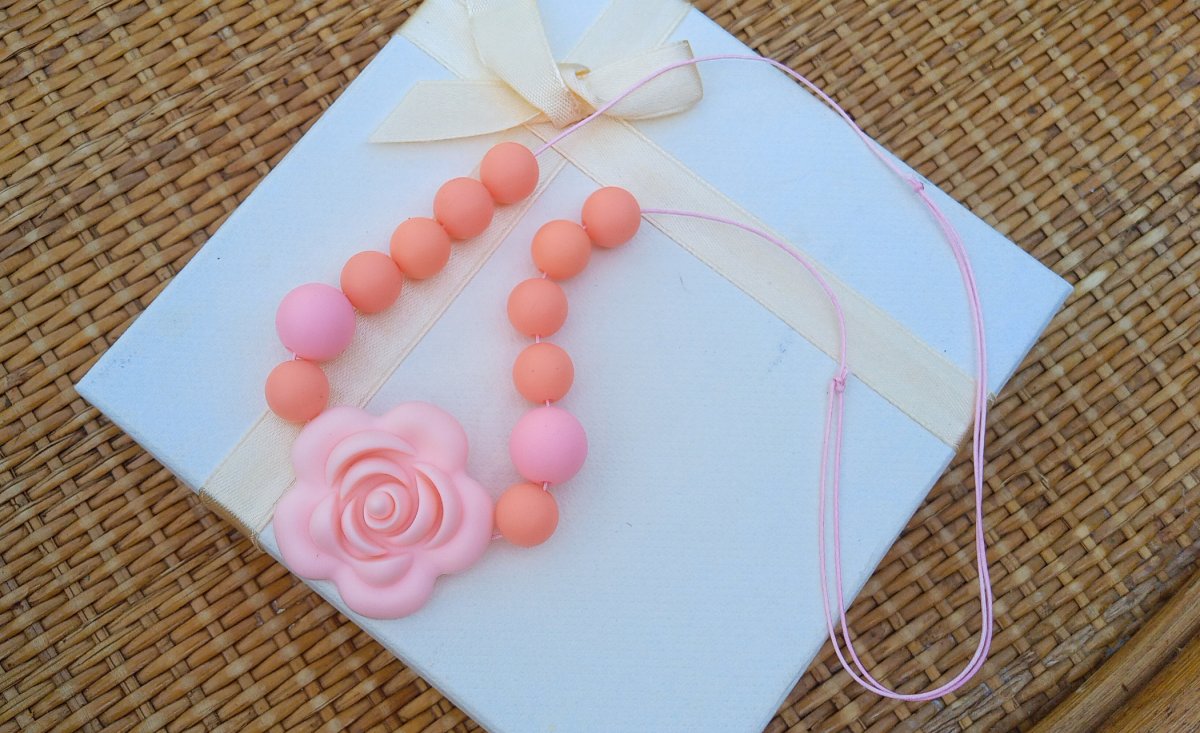 Nejen kojící růžovo meruňkové silikonové korále - náhrdelník - složené z korálků z potravinářského silikonu s velkou růžovou růžičkou uprostřed. Vaše miminko si tak při kojení, nebo mazlení může hrát, nebo se náhrdelníku držet. Silikonové komponenty jsou měkoučké, ideální na žužlání ?