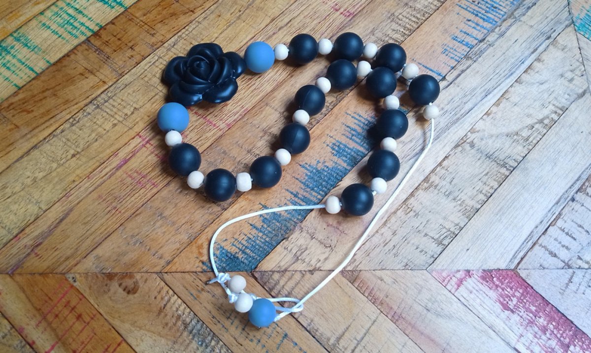 Elegantní nejen kojící korále vyrobené z korálků z potravinářského silikonu prokládanými menšími dřevěnými korálky s dominantní silikonovou růží.