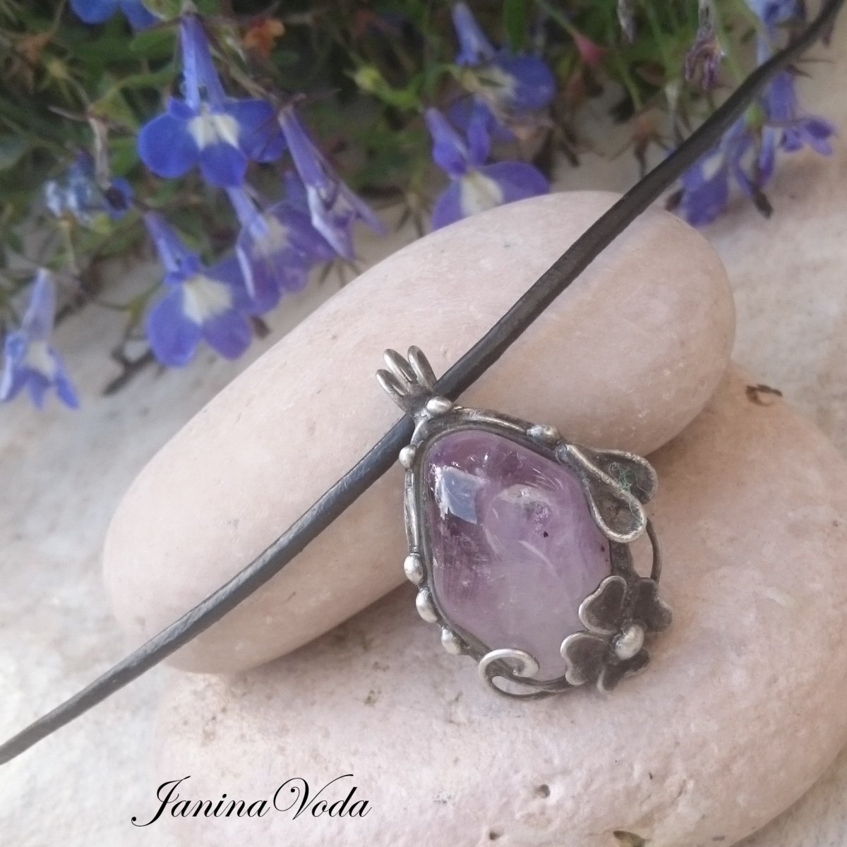 Cínovaný náhrdelník patinovaný, leštěný z kamene ametystu a drobného kvítku a lístku z cínu. Náhrdelník je patinovaný, následně leštěný a ošetřený antioxidačním přípravkem.
