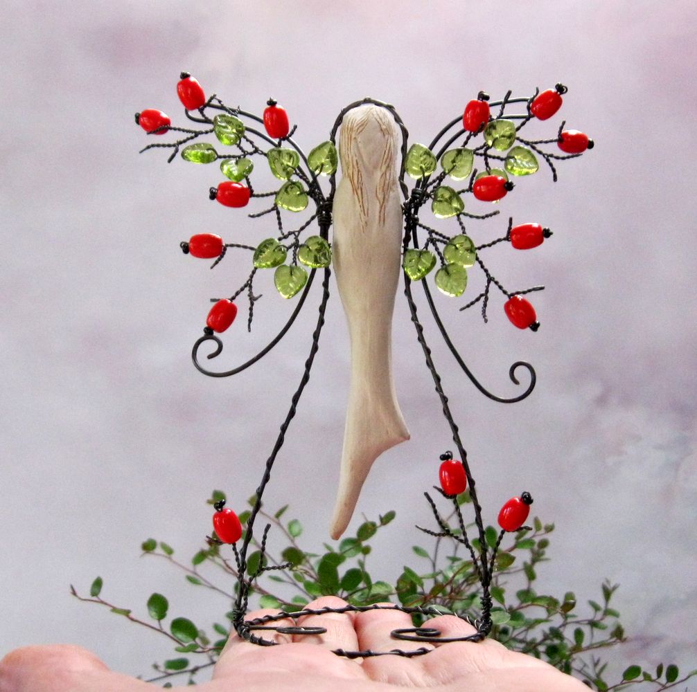 Nebo ho můžeme nazývat andělem. Tento je obsypaný zralými šípky plných vitamínů C :-) Křidélka jsou vytvarována z žíhaného drátu a korálků, tělo vymodelováno z keramické hlíny.