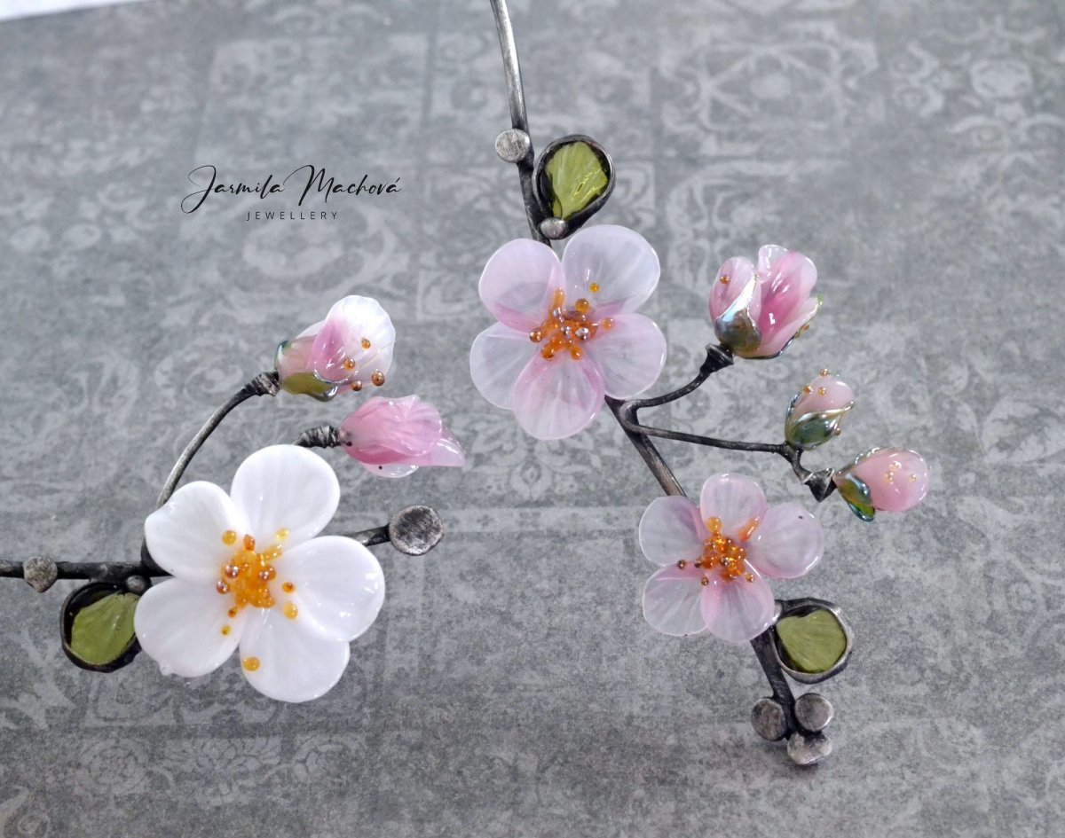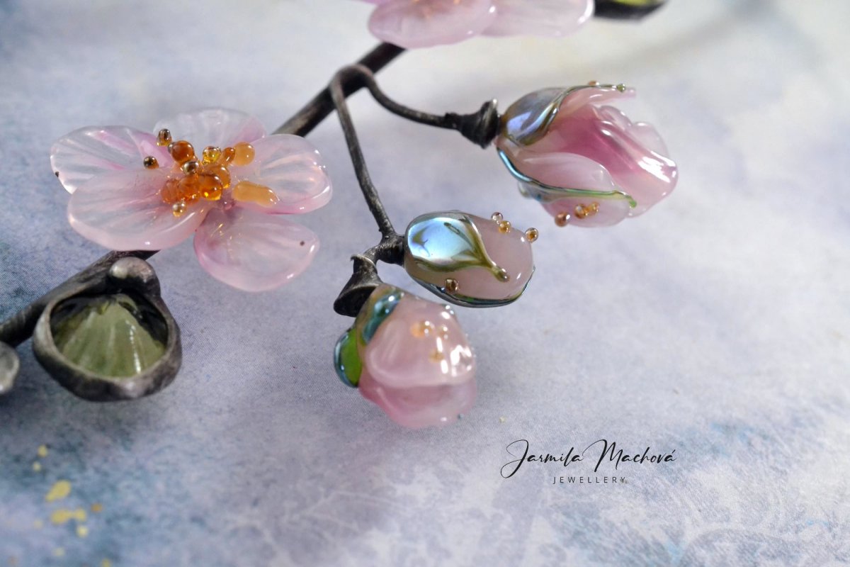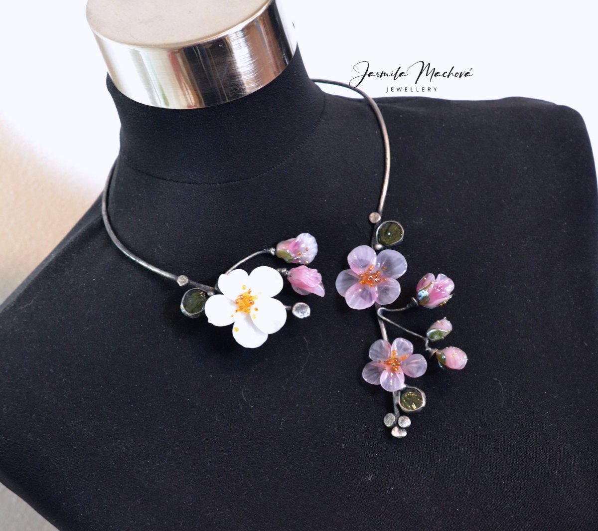 romantický náhrdelník se skleněnými květy šípkových růží....růžové barvy....ve spojení s cínovanou obručí