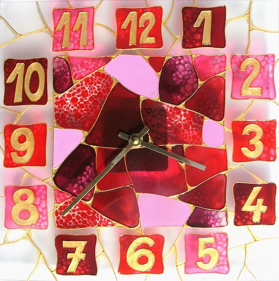 Hledáte výrazný barevný akcent pro svůj interiér? Tyto ručně malované hodiny v odstínech šťavnaté červené, malinové a jemné růžové doslova pulzují energií. Originální mozaikový design je doplněn o bohaté zlaté kontury a ručně psané číslice, které hodinám dodávají punc luxusu a umělecké ruční práce.