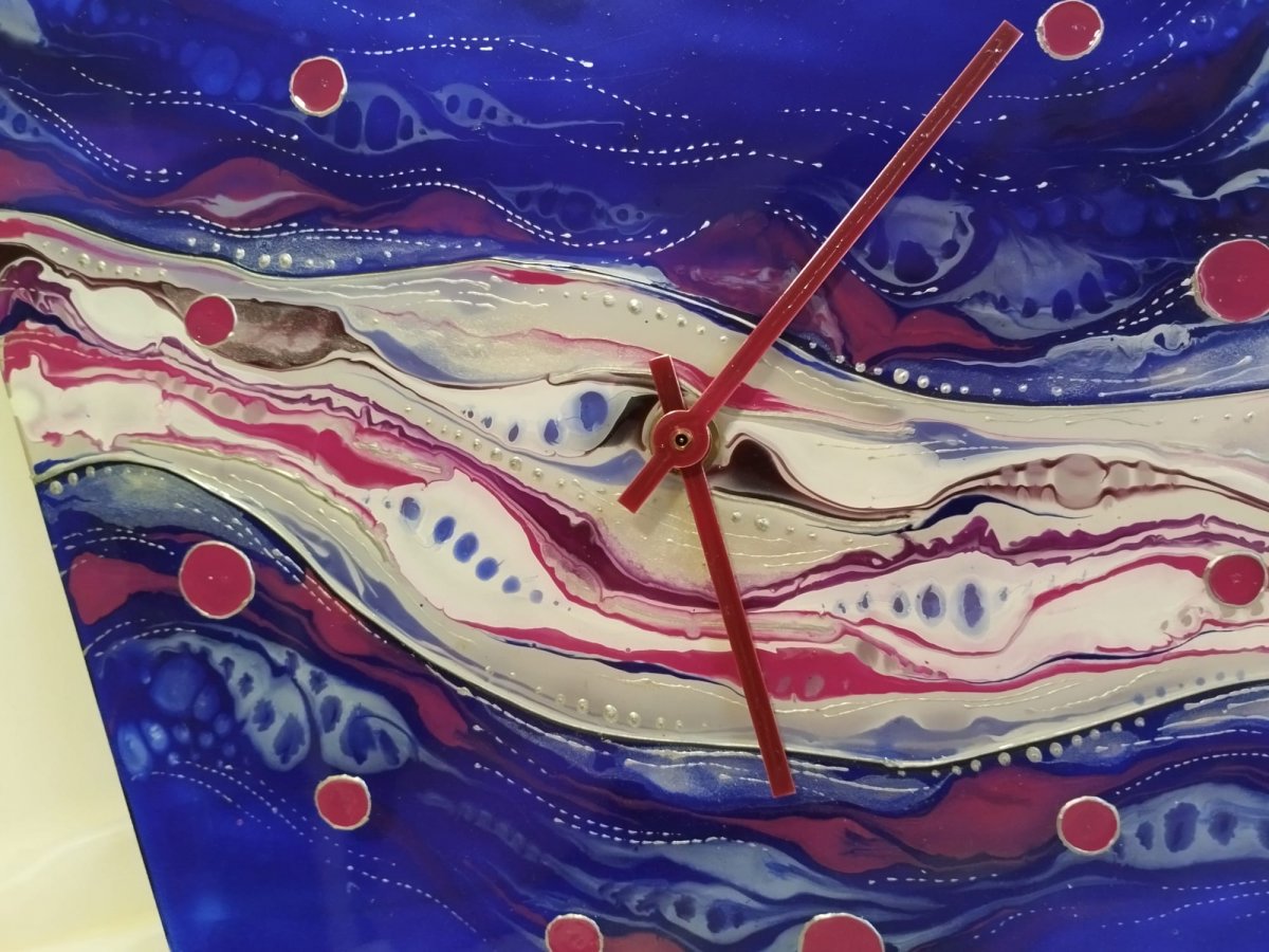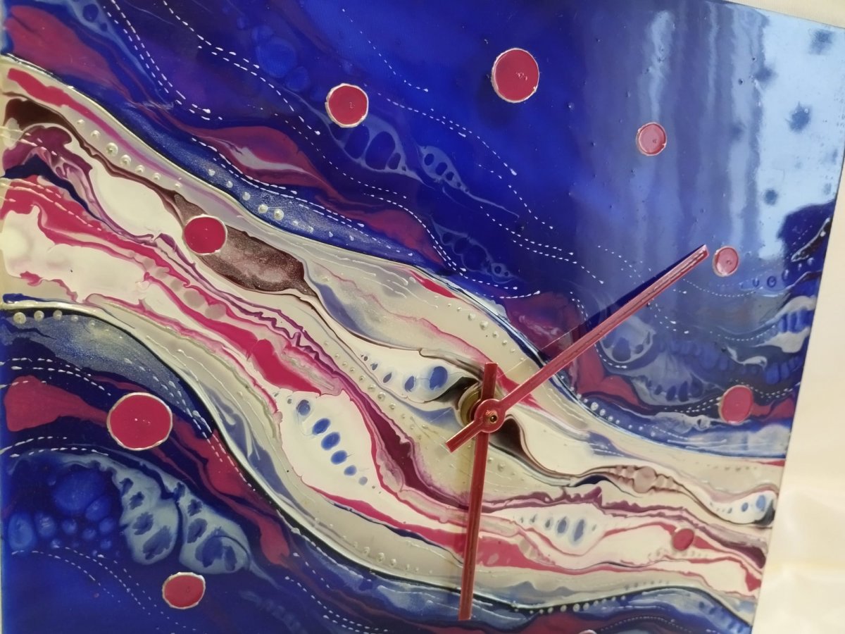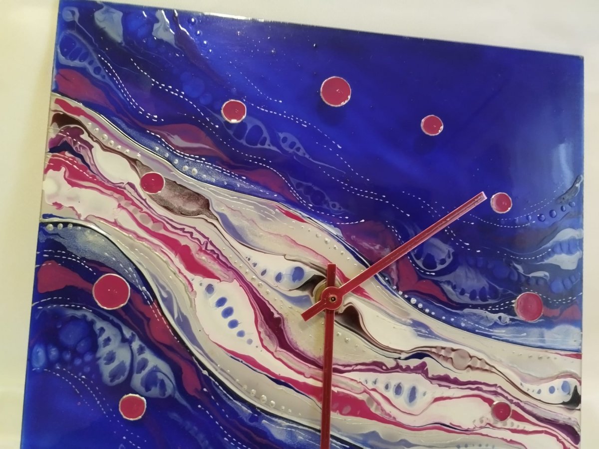 Hledáte doplněk, který okamžitě zaujme? Tyto ručně malované skleněné hodiny v sytých odstínech modré, bílé a kontrastní fuchsiové promění vaši stěnu v galerii.