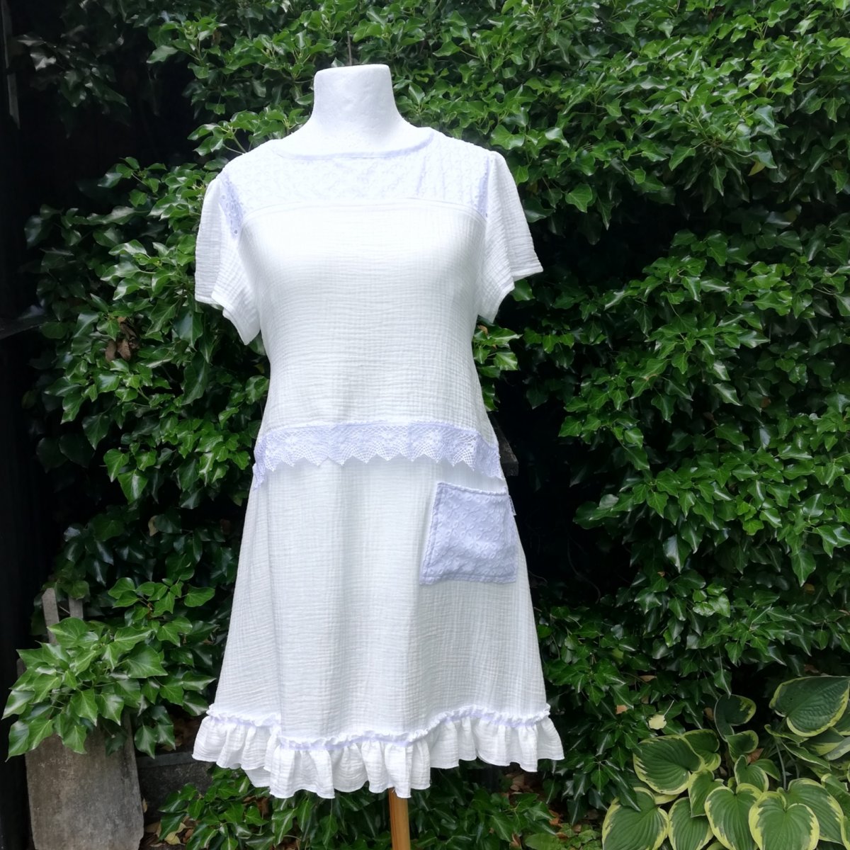 Letní slavnostnější šaty pod kolena jsou ušité podle vlastního návrhu. Rukávy jsou nabírané krátké,na předním i zadním díle je krajkové sedýlko.Přes prsa je gázovina dvojitě, zakončená nad kapsou paličkovanou krajkou.Vzadu na zavazování.V dolní části nabíraný volánek.Střih je volnější dole rozšířený.Krajková kapsa.