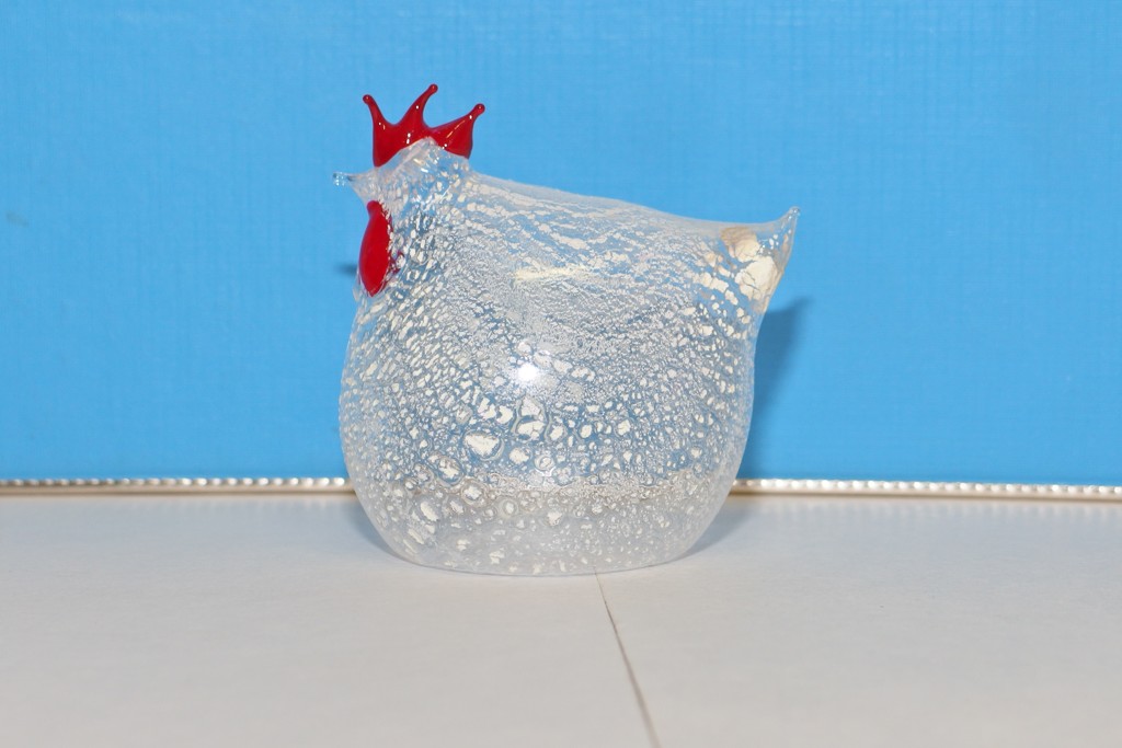 Slepička je foukaná volně z ruky bez formy, barva je zapálená do skla. Barvy bílé, zelené modré