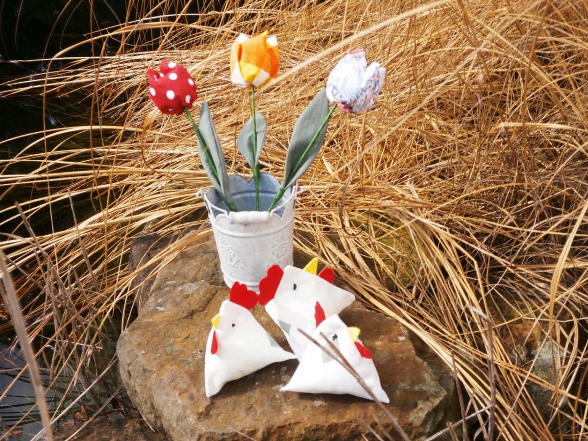 Slepičky jsou šité z bavlněné látky,plněné pes kuličkami,velké cca 10x10 cm.Vhodné k jarní dekoraci,k velikonoční výzdobě či jako drobný dáreček pro někoho blízkého.