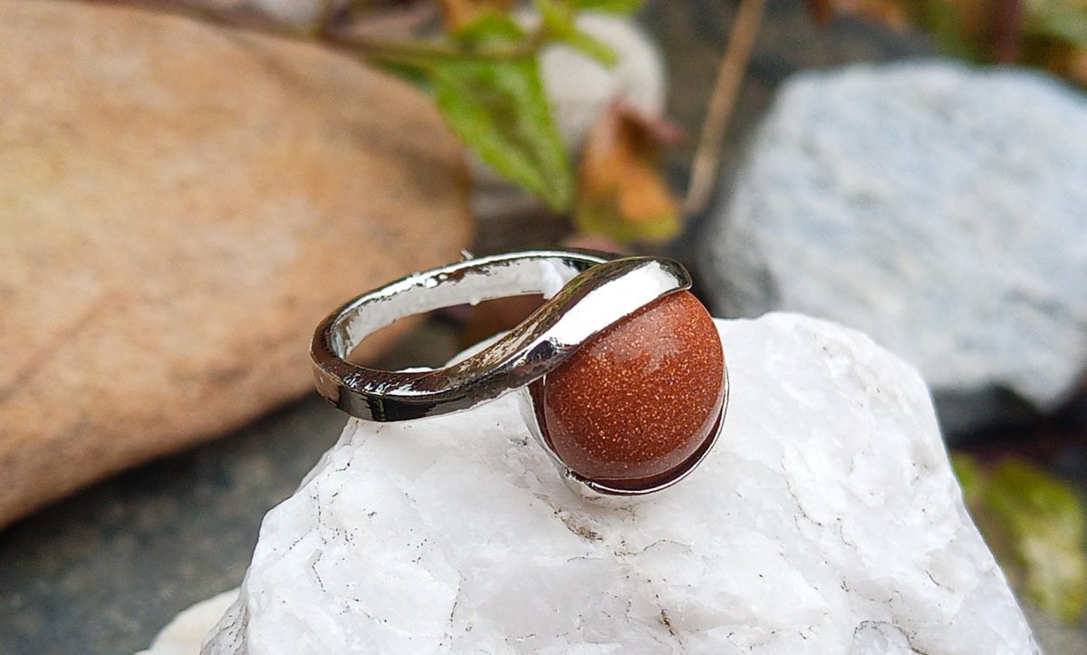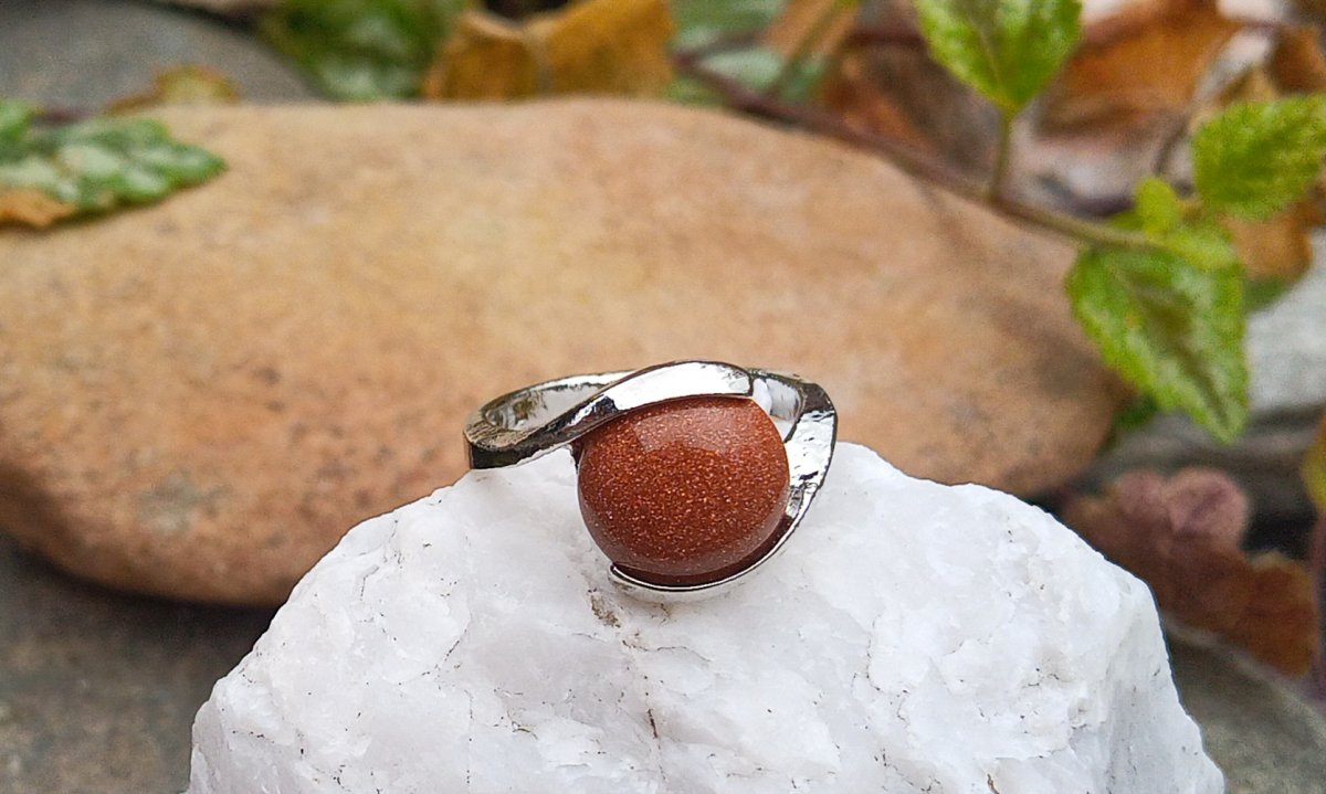 Třpytivý sluneční kámen zlatý avanturín o průměru 12 mm v elegantním postříbřeném kroužku, který kámen jakoby objímá. Nádherně zbarvený minerál, který rozzáří prst, který bude zdobit