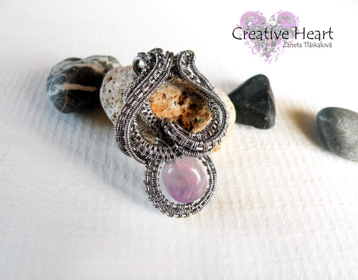 Šperk je vytvořen z kvalitní nerezové oceli, která je velmi stálá, nemění barvu ani tvar. Přívěsku dominuje lehce fialový AMETYST. Zavěšeno na jemném řetízku. Přívěsek je lehounký.Vytvořeno časově a technicky náročnou technikou Wire-wrapping.