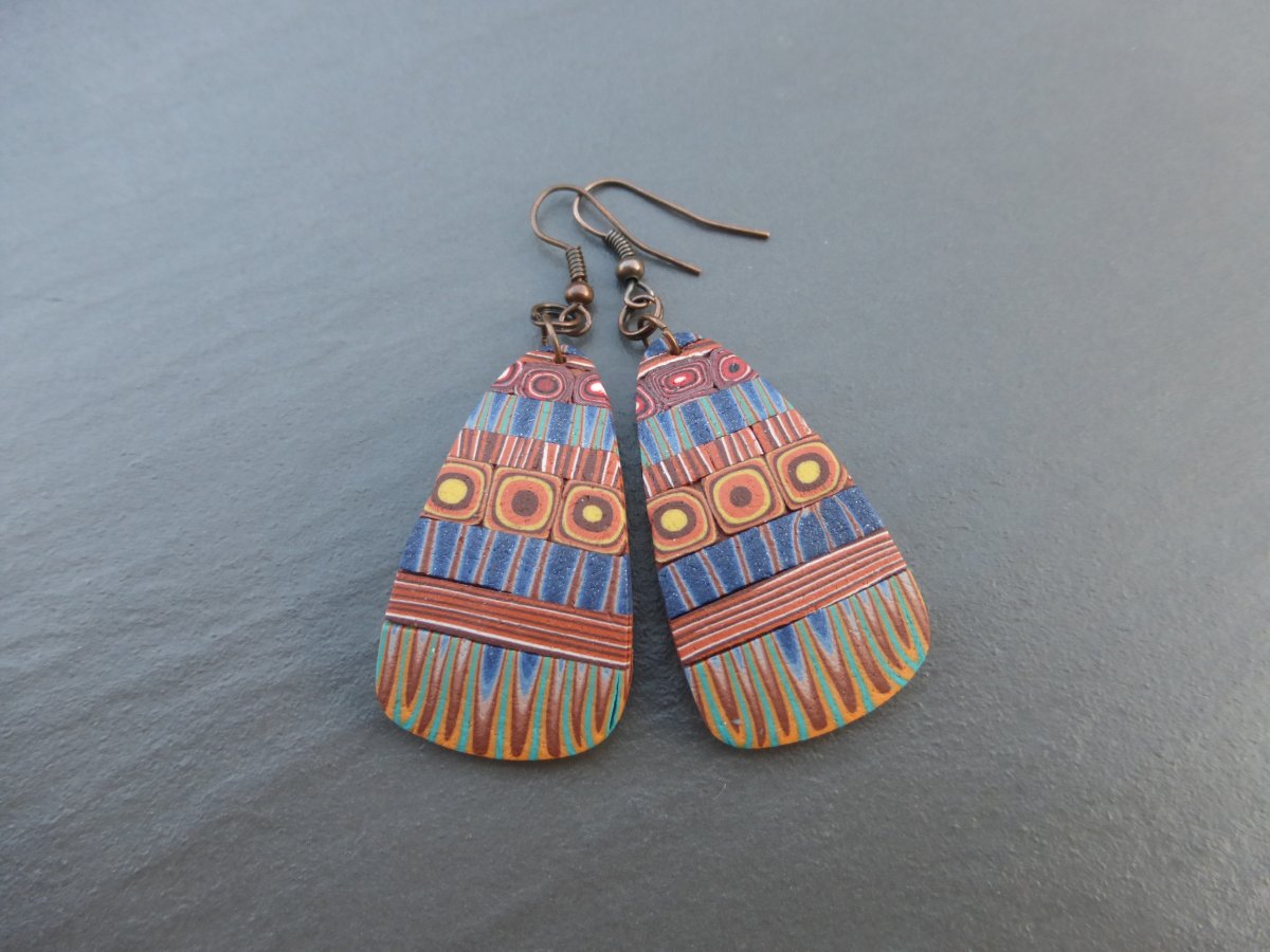 Náušnice z polymerové hmoty Fimo, lehce prohnutého tvaru, skládané z různých vzorů v hnědých, modrých, oranžových a čevených barvách. Přední strana vzorovaná, jemně texturovaná, zadní strana hnědá, taktéž texturovaná viz foto. Průměr v nejširších místech cca 4 x 2,3 cm, celková délka vč. afroháčku cca 6,5 cm. Komponenty staroměděné barvy.