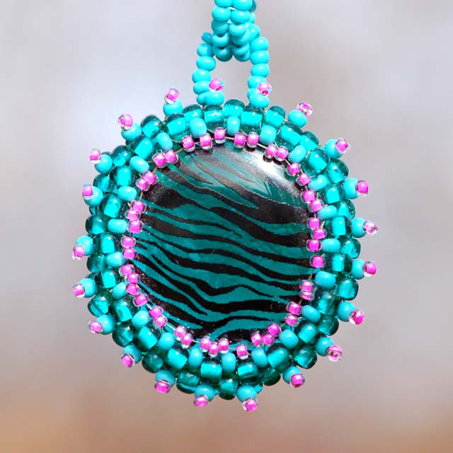 Smaragdový kabošon žíhaný tygřími pruhy, obšitý rokajlem na navlečeném rokailovém závěsu 52 cm, vzadu zapínání na černou karabinu. Za obšití kabošonu děkuji Aboladen, za kabošon Lucii Budaiové.