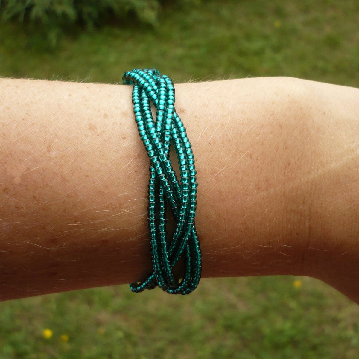 Náramek je tvořený z několika propletených řad drobných smaragdově zelených lesklých neprůhledných skleněných korálků.