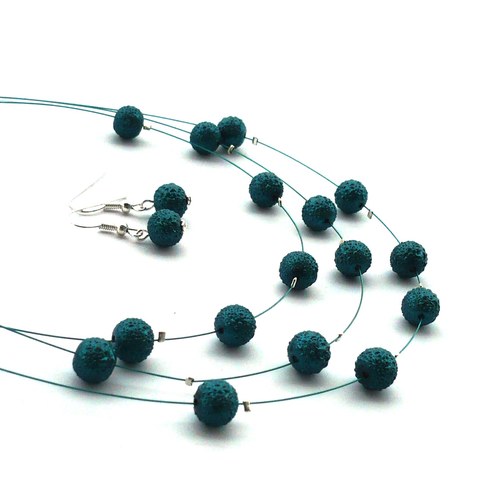 Náhrdelník je tvořený z tří řad různě rozmístěných tmavě smaragdově zelených voskovaných perliček s ozdobně zvrásněným povrchem. Perličky jsou navlečeny na bižuterním lanku zelené barvy.
