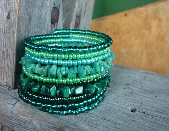 Náramek na paměť. drátu o průměru 6 cm, navléknutý českým rokajlem, malachitem a amazonitem.