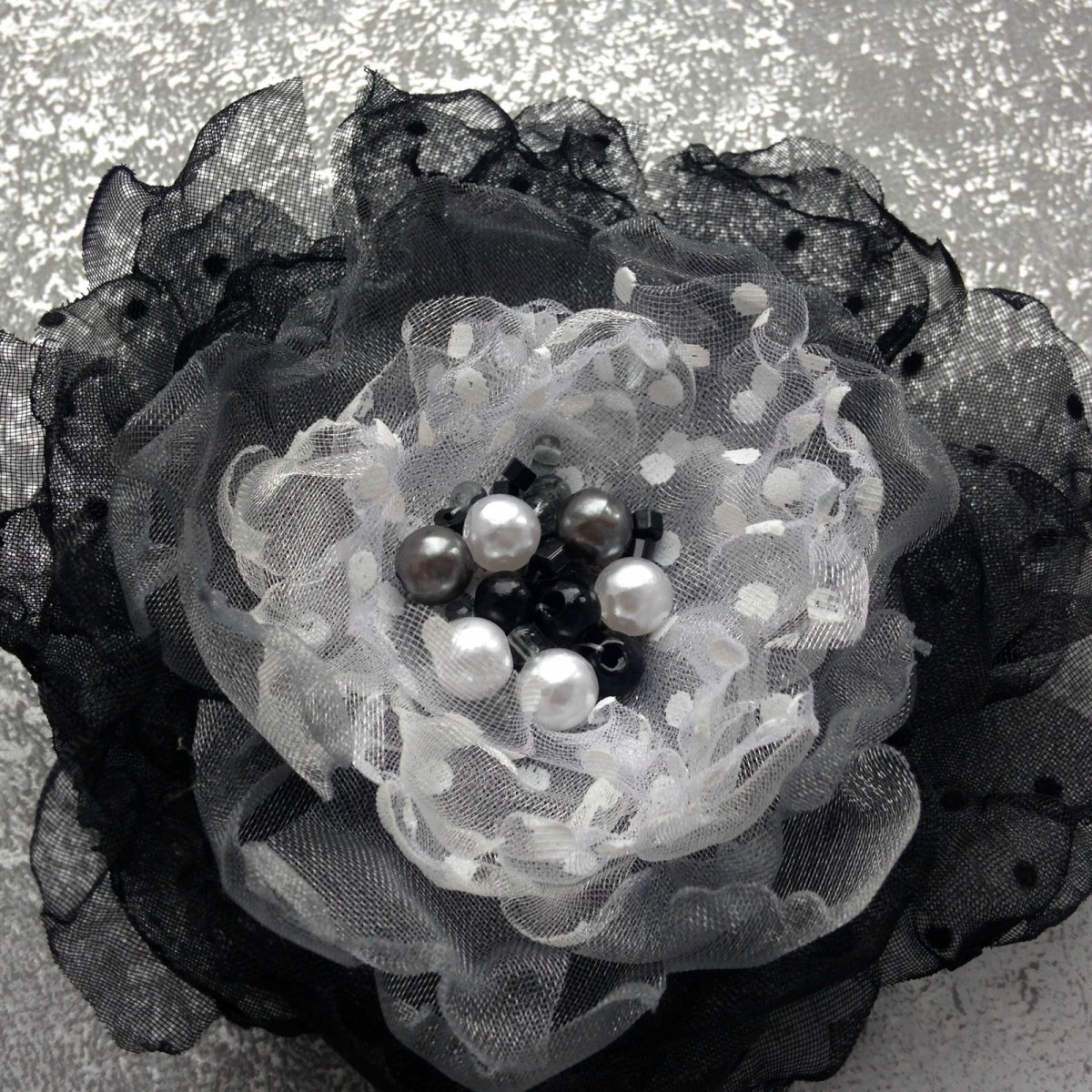 Organzová brož - kombinace černé, šedé a bílé barvy. Střed brože je vyšitý voskovanými korálky a rokajlem. Průměr brože cca 9 cm, brožové zapínání.